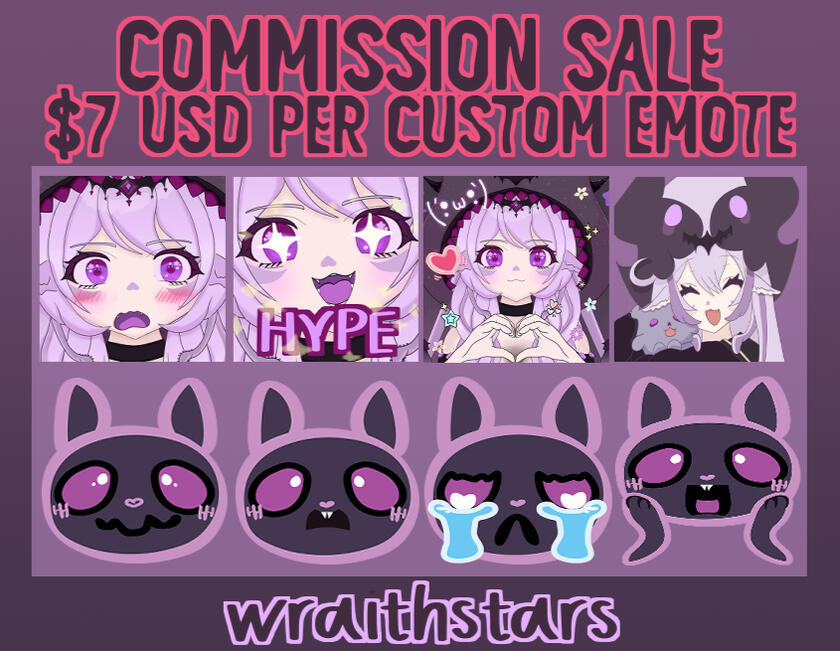 Emotes are $7 USD each. Please complete the form to make submit a comission reference. I will respond to the corresponding email to determine if you would like to pay on kofi or Paypal and gather more information.